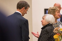 Janet L. Yellen took office as chair of the Board of Governors of the Federal Reserve System on February 3, 2014, for a four-year term ending February 3, 2018. Yellen also serves as Chairman of the Federal Open Market Committee, the System's principal monetary policymaking body. Prior to her appointment as Chair, Yellen served as vice chair of the Board of Governors, taking office in October 2010, when she simultaneously began a 14-year term as a member of the Board that will expire January 31, 2024. Yellen is Professor Emeritus at the University of California at Berkeley where she was the Eugene E. and Catherine M. Trefethen Professor of Business and Professor of Economics and has been a faculty member since 1980. She took leave from Berkeley for five years starting August 1994. She served as a member of the Board of Governors of the Federal Reserve System through February 1997, and then left the Federal Reserve to become chair of the Council of Economic Advisers through August 1999. She also chaired the Economic Policy Committee of the Organization for Economic Cooperation and Development from 1997 to 1999. She also served as president and chief executive officer of the Federal Reserve Bank of San Francisco from 2004 to 2010. She is a member of both the Council on Foreign Relations and the American Academy of Arts and Sciences. She has served as president of the Western Economic Association, vice president of the American Economic Association and a fellow of the Yale Corporation. She graduated summa cum laude from Brown University with a degree in economics in 1967, and received her Ph.D. in Economics from Yale University in 1971. She received the Wilbur Cross Medal from Yale in 1997, an honorary doctor of laws degree from Brown in 1998, and an honorary doctor of humane letters from Bard College in 2000. An Assistant Professor at Harvard University from 1971 to 1976, Yellen served as an Economist with the Federal Reserve's Board of Governors in 1977 and 1978, and on the faculty of the London School of Economics and Political Science from 1978 to 1980. Yellen has written on a wide variety of macroeconomic issues, while specializing in the causes, mechanisms, and implications of unemployment.